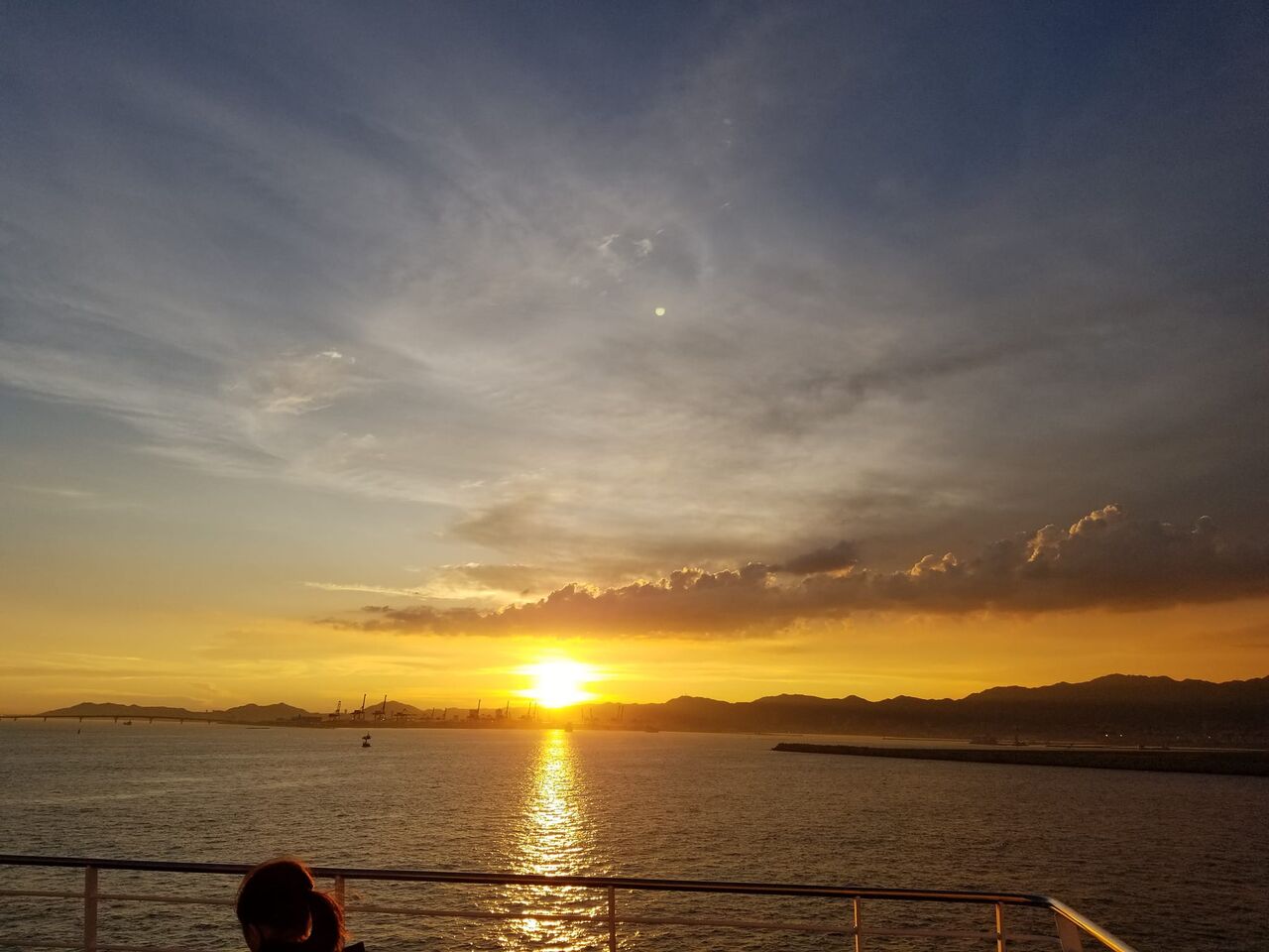 出航後、夕焼けを背景に、神戸港付近を航行