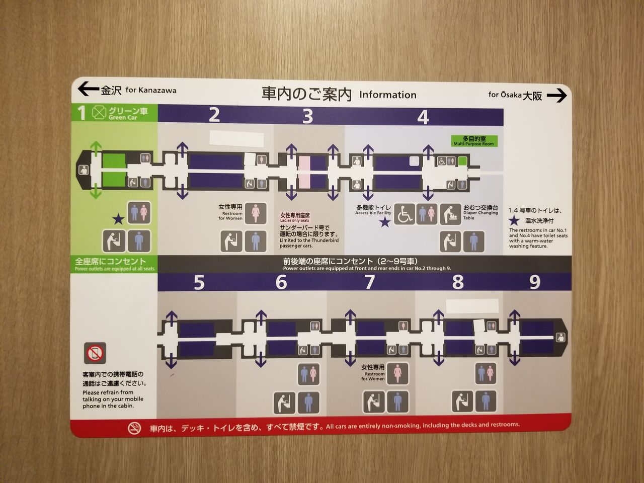 2015年の北陸新幹線の長野~金沢開通に合わせて、特急サンダーバードも塗装変更や内装のリフレッシュが行われ、より重厚で快適なものになったように思えます。普通車と比べると、座席が2+1列で、座席の前後の間隔も、座席の横幅も広く、枕やフットレストが付き、肘掛から出るテーブルやカップホルダーが付き、コンセントも全席付いている点でしょうか。