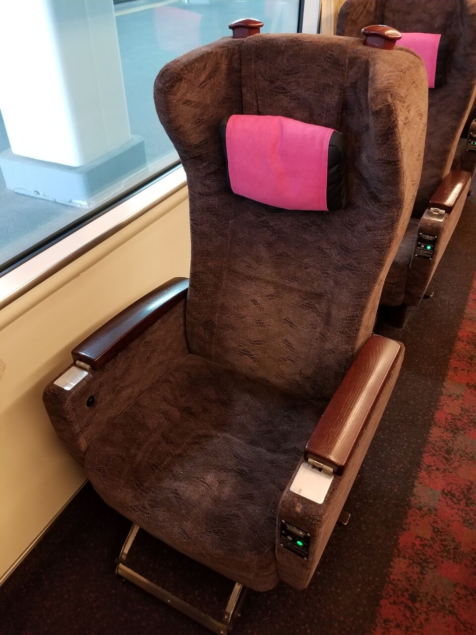 グリーン車の座席。枕やフットレスト、肘掛からはテーブルやカップホルダーが付く。