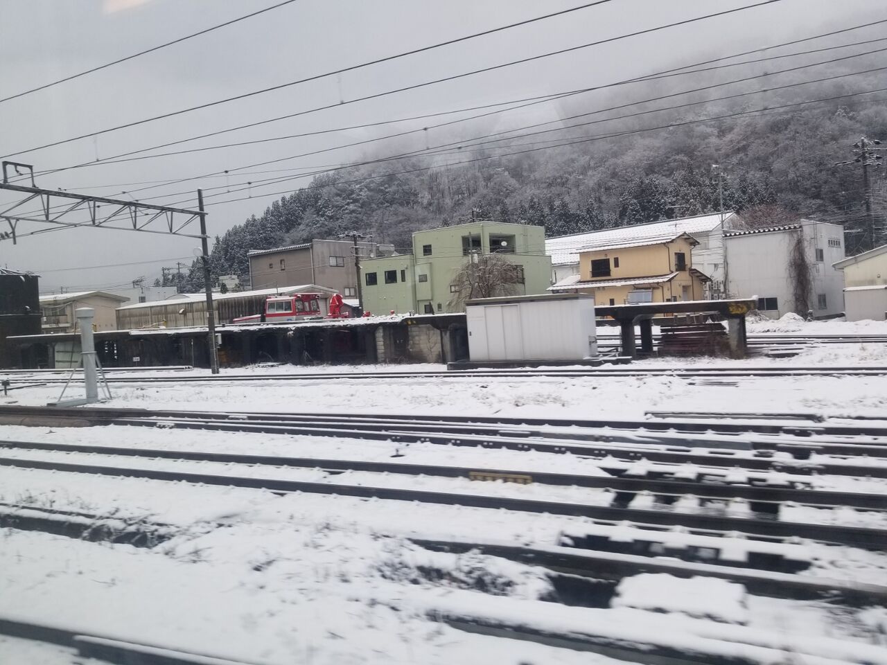 北陸トンネルを抜けて、今庄付近を走行中。この時は、ここだけ雪景色に。武生まで行き、福井平野に入ると、ほとんど雪はない状況に。3月16日以降、特急サンダーバードからは味わえなくなる車窓。