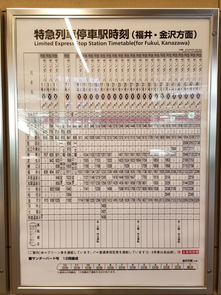 この列車、最速達の列車ではありませんが、大阪6:30・新大阪6:34・高槻6:45・京都6:59・敦賀7:57・福井8:29・金沢9:13と、ほぼ最小限に停車駅を絞った列車と言えます。