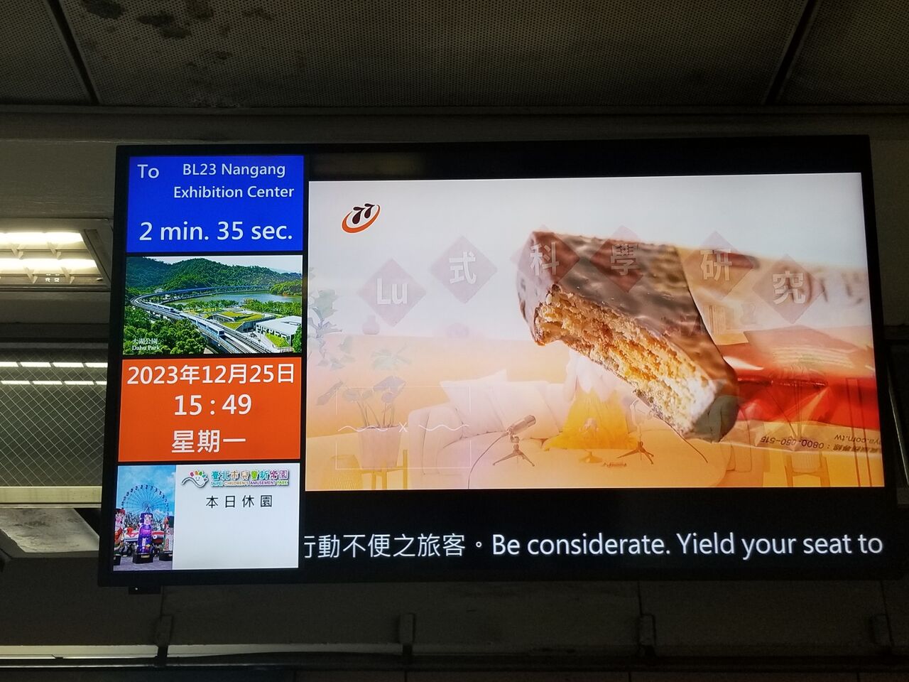 台北MRTの接近表示。2min35sec、2分35秒の秒単位で表示。