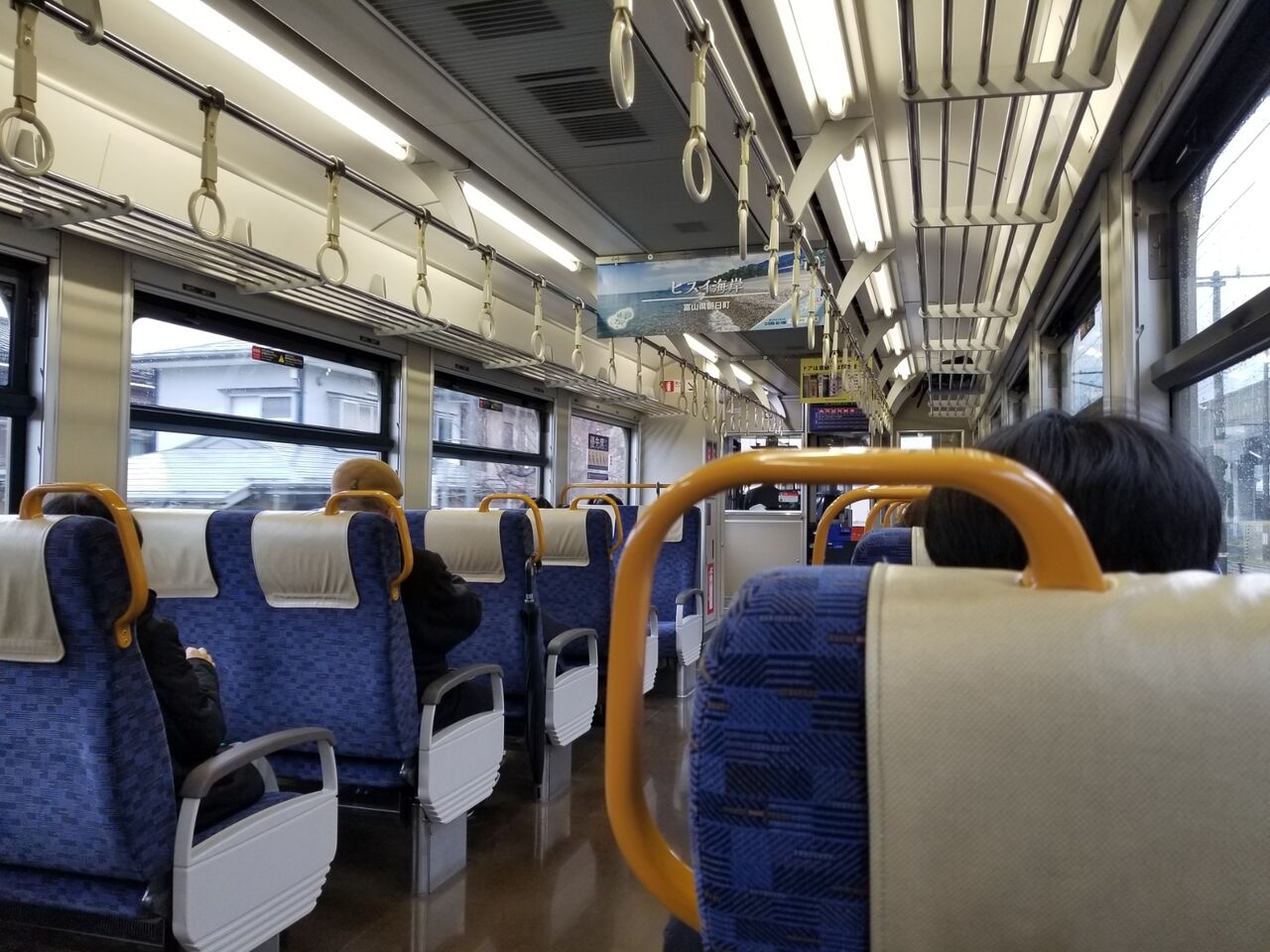 この日本海ひすいラインの車両ET122形は、元がJR西日本の路線だったこともあってか、JR西日本のキハ122がベースとなっていて、車内は転換クロスシート。車内の内装やシートの色合いを見ると、阪和線・関空紀州路快速用の223系と全く同じに見えます。