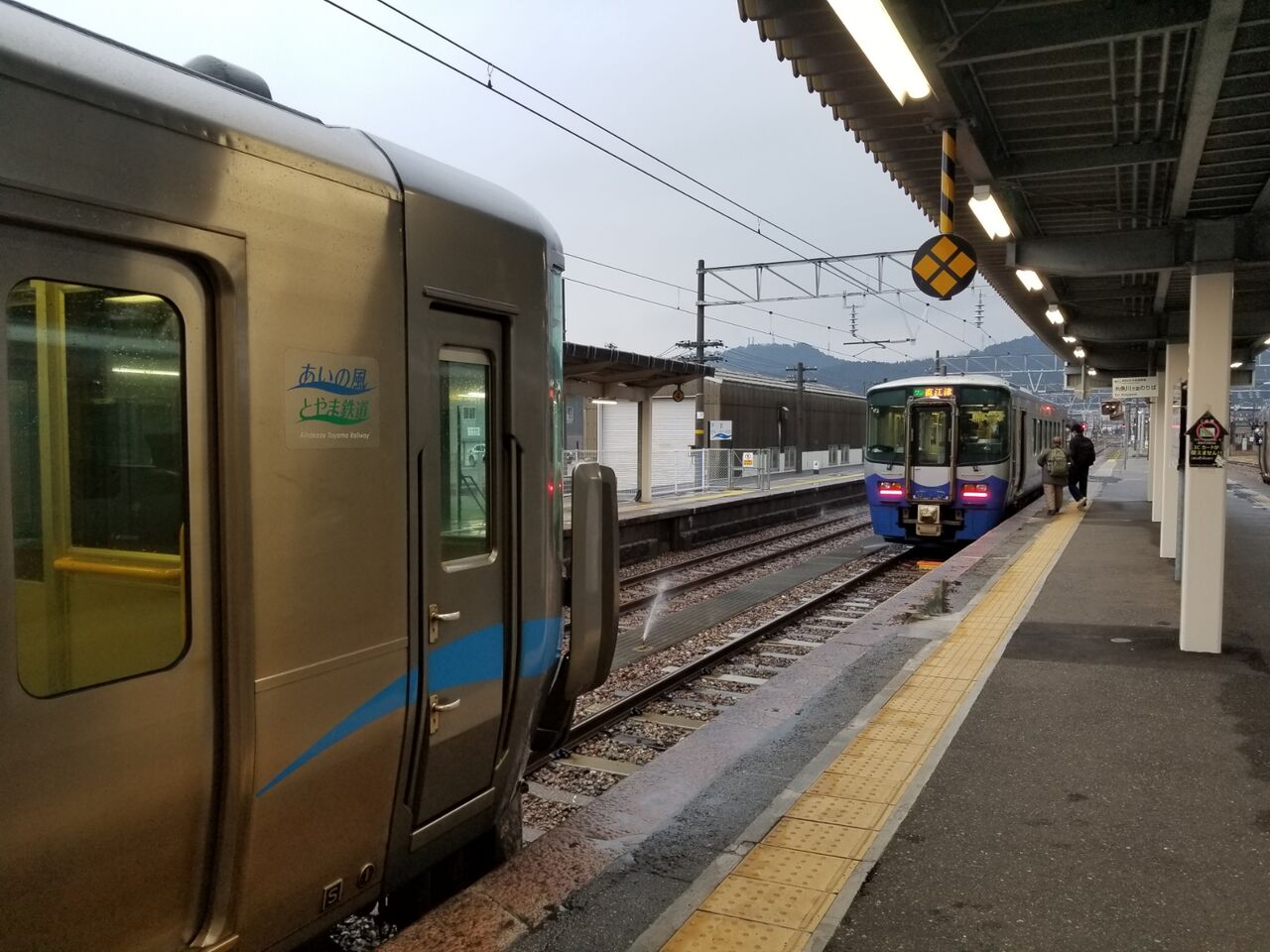 泊駅にて。あいの風とやま鉄道車両とえちごトキめき鉄道車両が、同一ホーム上に縦列停車する様子。