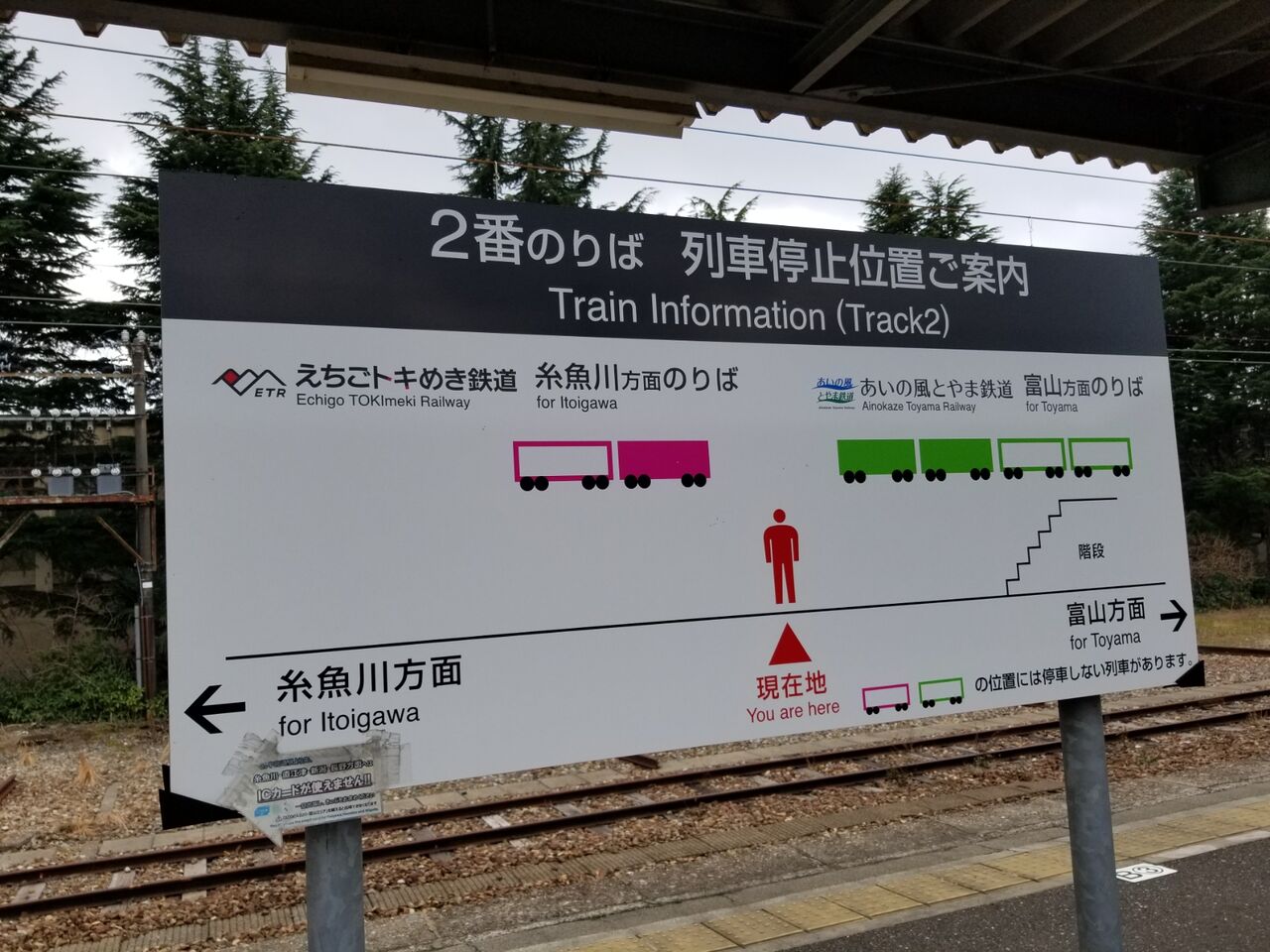 富山方面と糸魚川方面の停車位置の案内