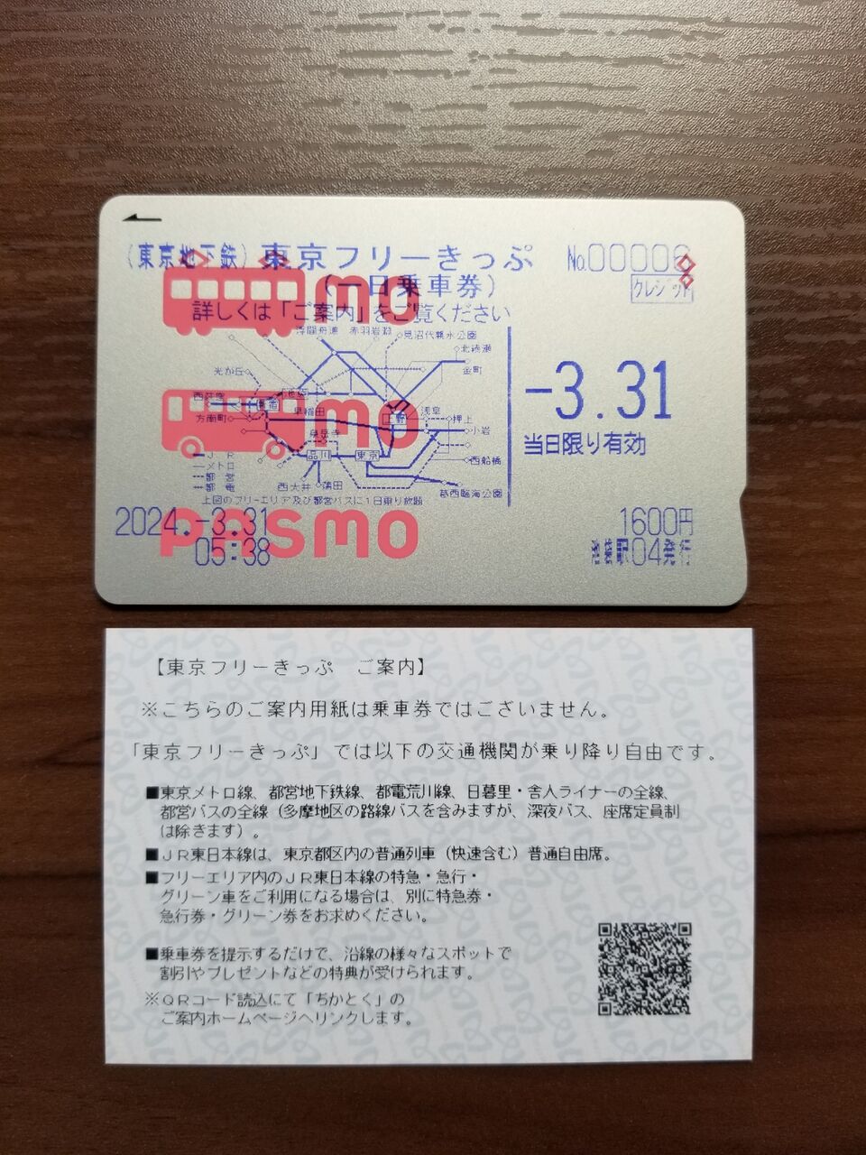 このフリーきっぷは紙のきっぷの他、JR東日本の駅ではICカードSuicaで、東京メトロ・都営の駅ではICカードPASMOに載せて購入することが可能です。個人的には関西在住ですが、Suica・PASMOともに所持していて、過去にもこのフリーきっぷや下記の東京メトロ24時間券をPASMOで使用したこともあり、引き続き所持しているPASMOを使うため、東京メトロで購入しました。