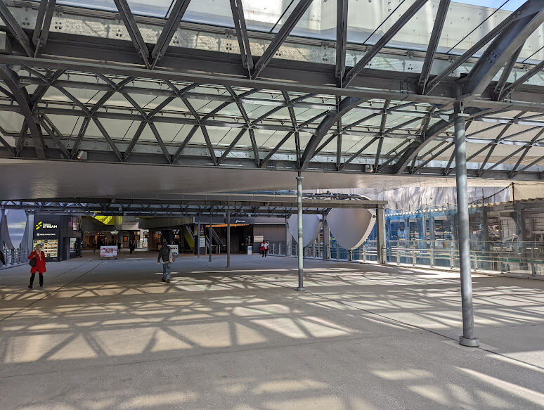 スクランブルスクエアからストリームへ至る通路。地上時代の駅の屋根などが一部残る。