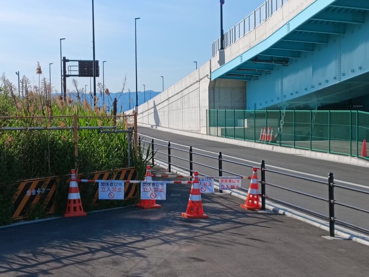 夢舞大橋を渡ってすぐの場所(万博会場外では夢洲唯一のコンビニ・セブンイレブンもある交差点)にある、西ゲートへ通じる道路。歩道はバリケードで封鎖されていて、一般の歩行者は通ることができない。