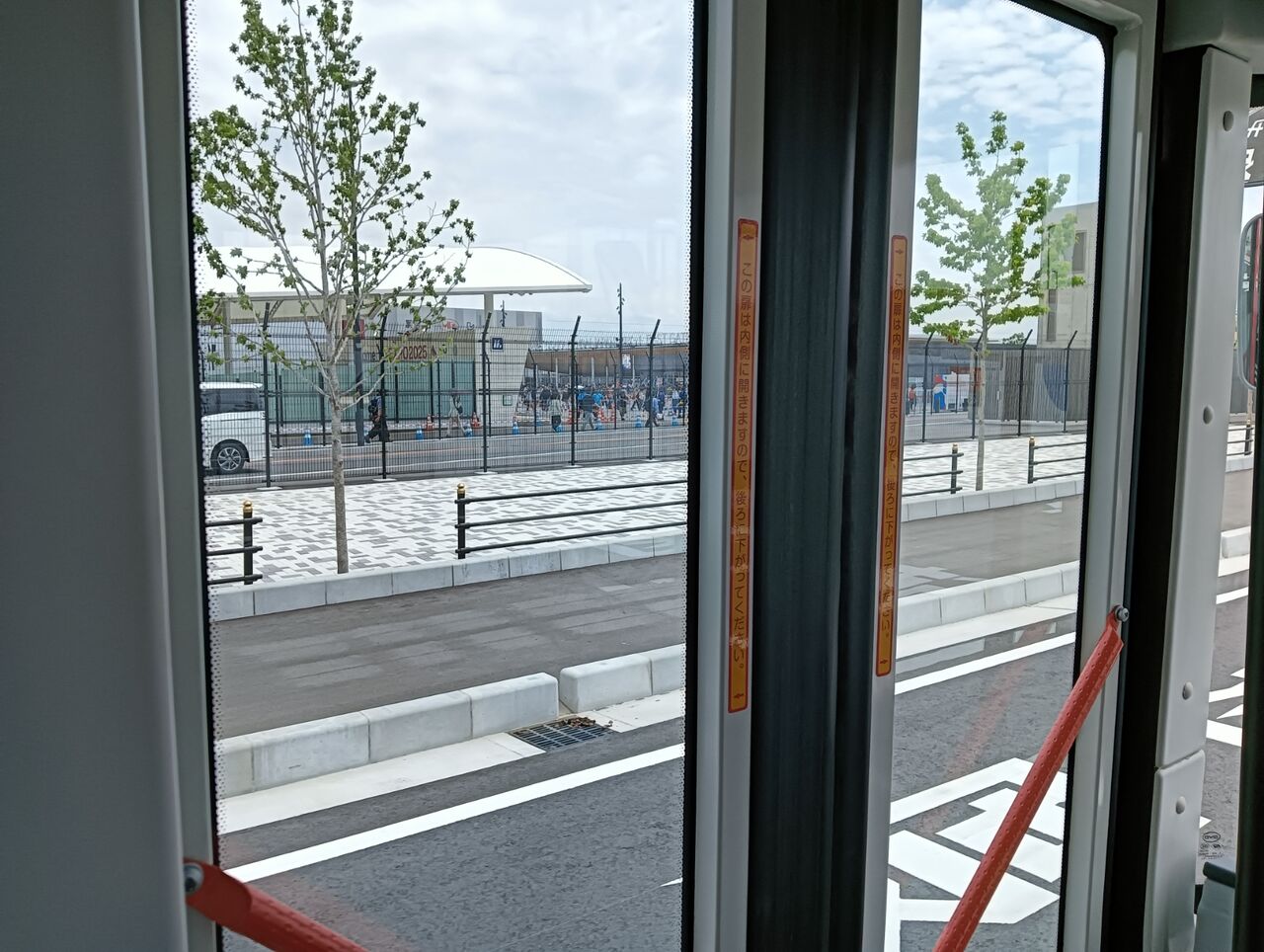 万博会場行き、シャトルバスの車内から、東ゲート前・夢洲駅を通過。歩道は整備されているが、6/15まで一般の歩行者は一切通ることができなかった。恐らく、ここを通ることになるのでしょう。